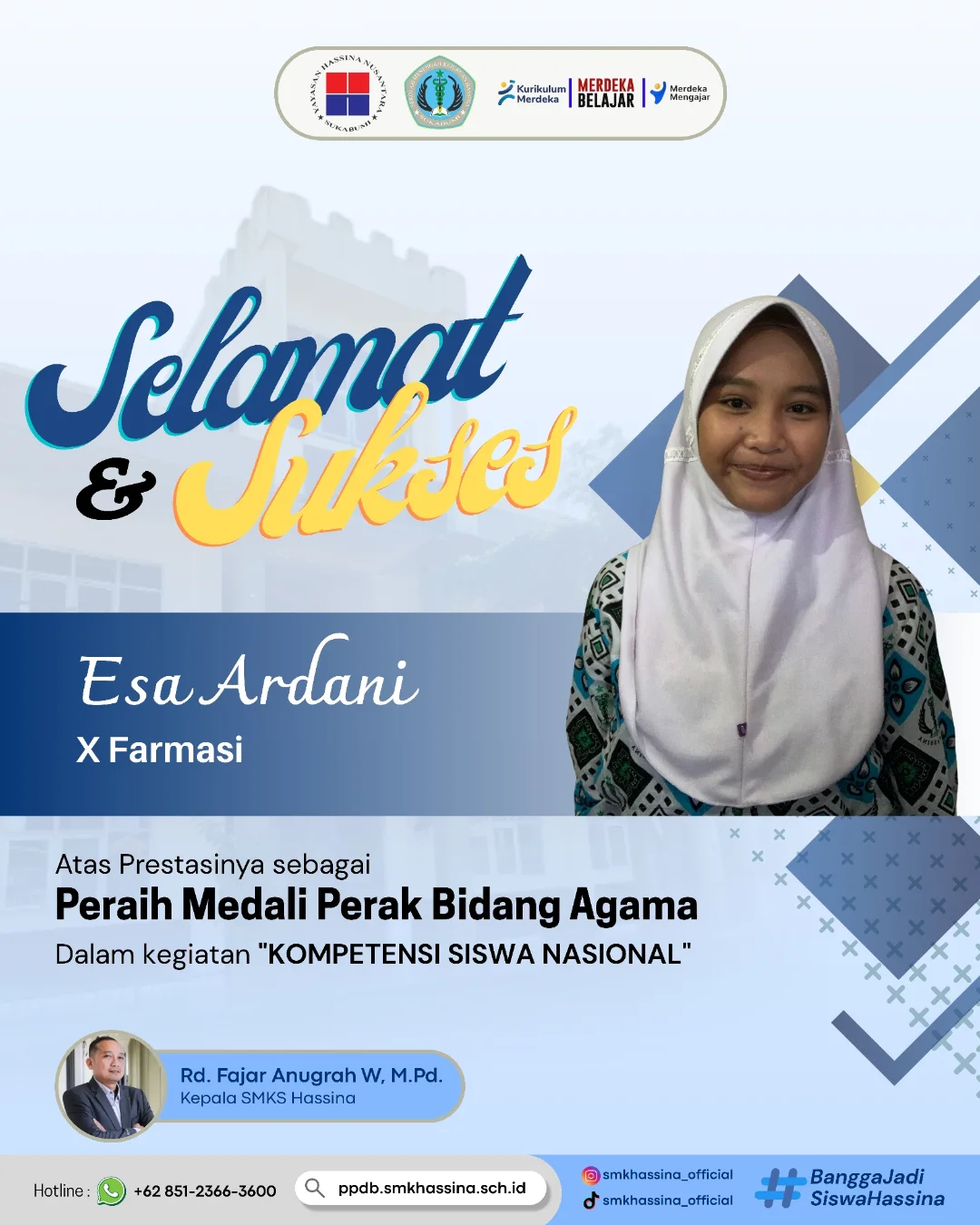 Sekolah SMKS Hassina kembali menorehkan prestasi membanggakan. Kali ini datang dari Esa Ardani, siswi kelas X Farmasi, yang berhasil meraih Medali Perak Bidang Agama dalam ajang bergengsi “Kompetensi Siswa Nasional”.